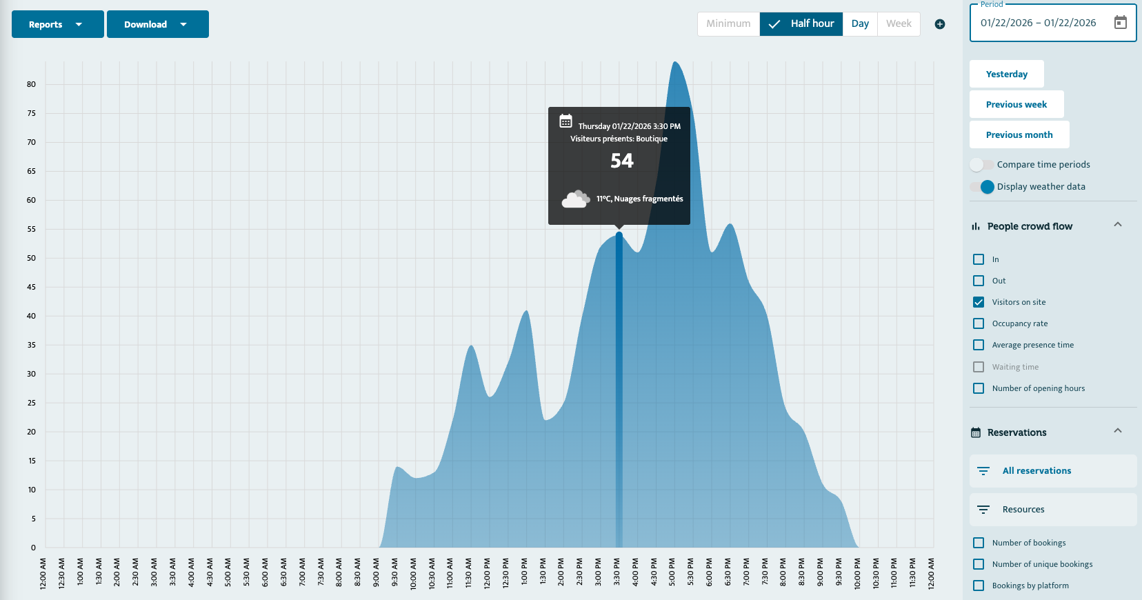 You can overlay your footfall curves with current weather conditions to better analyze the impact of weather on your data.